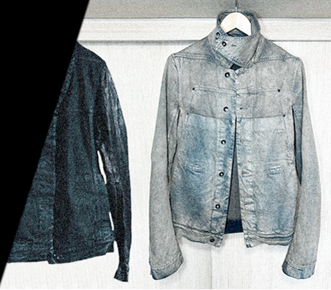 Вещь выполнена из комбинации денима чёрного и выстиранного серого денима, с рукавами, выполненными из тонкой
